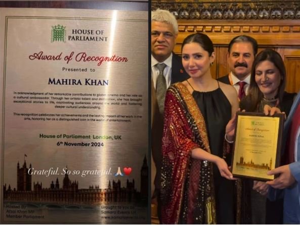ماہرہ خان نے انسٹاگرام پر اسٹوری شیئر کی ہے جس میں انہوں نے برطانوی پالیمنٹ کی جانب سے ملنے والے ایوارڈ کی تصویر شیئر کی ہے اور اس پر شکریہ ادا کیا ہے۔