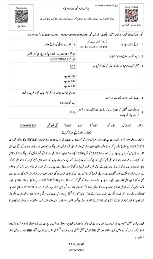 تھانہ بمبانوالا پولیس اس ہولناک واقعہ پر تفشیں کے لیے سر جوڑ کر بیٹھ گئی اور مقتول کے والد اور بھائی کو گرفتار کر لیا۔ دوران تفتیش پولیس کو معلوم ہوا کہ اسامہ پر آسیب کا شبہ ظاہر کیا گیا تھا اس دوران عامل کو بلایا گیا جو مبینہ جن حاضر کرنے کےلئے اسامہ پر ساری رات تشدد کرتا رہا۔ پیر خالد جاوید اسامہ کو ڈنڈوں سے مارتا رہا اس دوران اسامہ کی موت ہوگئی ۔ پیر خالدجاوید نے چالاکی سے بچنے کی کوشش کرتے ہوئے اس واقعے کو جنات کی کارروائی قرار دے دیا۔ پولیس نے مقدمہ والد ارشد ، بھائی وقاص اور پیر خالد جاوید کے خلاف مقدمہ درج کرلیا ہے ۔ ڈی ایس پی عابد رشید کا کہنا ہے مقتول اسامہ کی پوسٹ مارٹم رپورٹ کا انتظار ہے ، رپورٹ کے بعد مزید کارروائی کی جائے گی ۔