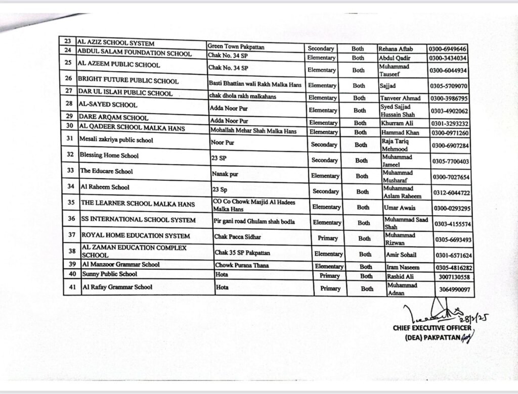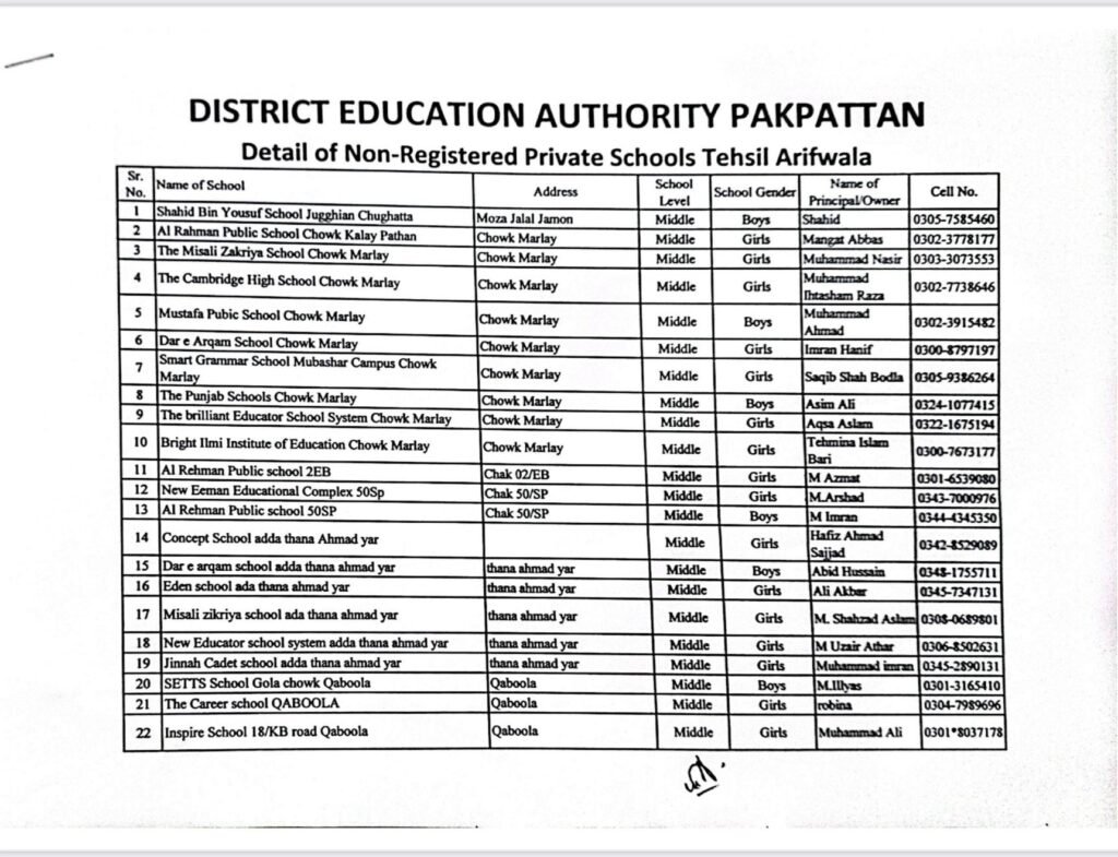 پاک پتن میں بغیر رجسٹریشن 74نجی تعلیمی ادارے چلائے جانے کا انکشاف