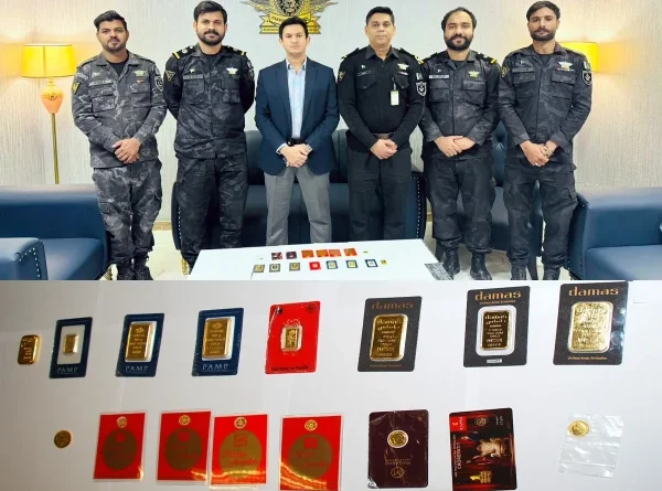 اسسٹنٹ کلکٹر کسٹمز خضر فیض کے مطابق کارروائی کے دوران خالص سونے کے 8 بسکٹ اور 8 سکے برآمد کیے گئے۔