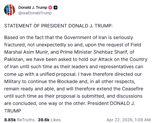 صدر ٹرمپ نے کہا کہ جنگ بندی میں اس وقت تک توسیع برقرار رہے گی جب تک ایران کی جانب سے تجویز پیش نہیں کی جاتی اور مذاکرات کسی نتیجے پر نہیں پہنچ جاتے، امریکی فوج کو ہدایت دی ہے کہ ایران کے خلاف ناکہ بندی جاری رکھی جائے اور دیگر تمام معاملات میں مکمل طور پر تیار رہا جائے۔