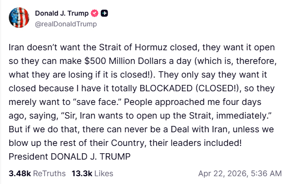 بعدازاں سوشل میڈیا پلیٹ فارم ٹروتھ سوشل پر جاری اپنے تازہ بیان میں امریکی صدر ٹرمپ نے دعویٰ کیا ہے کہ امریکا نے آبنائے ہرمز کو مکمل طور پر بند کر دیا ہے اور ایران دراصل اسے کھولنا چاہتا ہے تاکہ یومیہ کروڑوں ڈالر کی آمدنی دوبارہ حاصل کی جا سکے۔